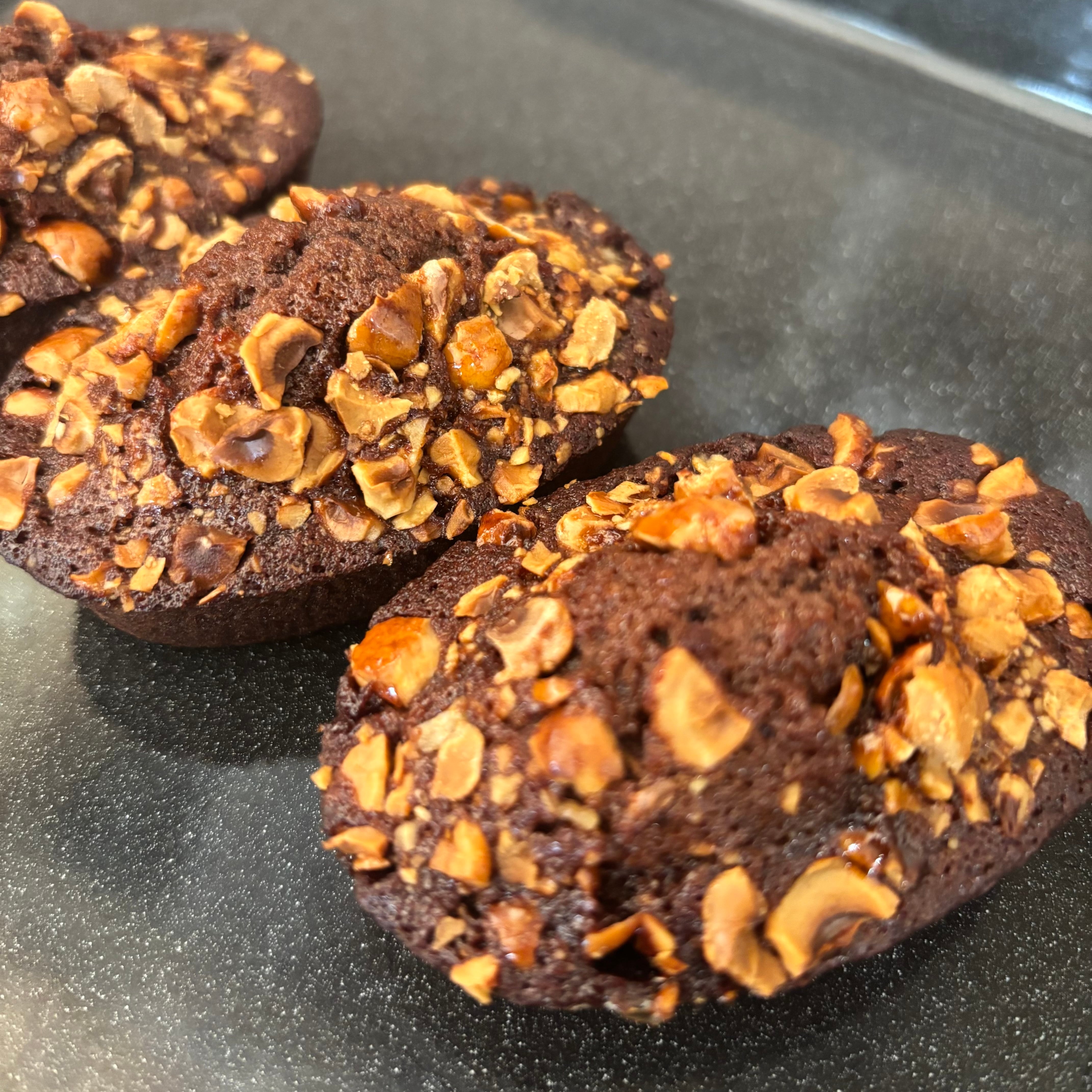 チョコレート風味のフィナンシェ生地にヘーゼルナッツのキャラメリゼを乗せて焼き上げました。